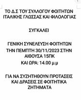 Στις 9/6/2023 έλαβε χώρα συνεδρίαση για την συγκρότηση του Δ.Σ του Φοιτητικού Συλλόγου του Τμήματος Ιταλικής Γλώσσας και Φιλολογίας.